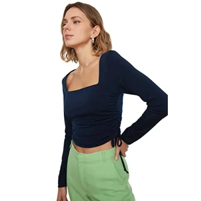 Material Composition: 96% Polyester,4% Elastane Occasion: The Navy Blue Slim fit Blouse is perfect for Casual occasions. Our Collection offers affordable fashion for every occasion and style – from casual & relaxed to smart & elegant. Trendyol Collection translates the latest runway trends into wearable outfits for your wardrobe. Design: This Basic Knit Blouse for Female has Long sleeve Square collar Plain pattern. It is Slim fit fit. If you are in between size,please size up. Wash at a maximum temperature of 30°C. Do not use bleach. Do not tumble dry. Iron at low temperature. Do not dry clean.