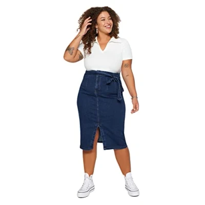Trendyol Woman Pencil Skirt Regular fit Denim Plus Size Skirt,Dark Blue,46
