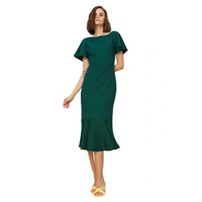 Material Composition: 88% Polyester, 12% Elastane Occasion: The Grün Regular fit Dresses is perfect for Day / Night occasions. Our Basic Collection offers affordable fashion for every occasion and style – from casual & relaxed to smart & elegant. Trendyol Collection translates the latest runway trends into wearable outfits for your wardrobe. Design: It is a Boat neck Midi Dress for Women . This Woven Dress has a Wrapover design with Plain pattern. If you are in between size,please size up. Wash at a maximum temperature of 30°C. Do not use bleach. Do not tumble dry. Iron at low temperature. Do not dry clean.
