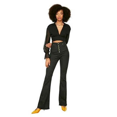 Material Composition: 98% Cotton,2% Elastane Occasion: The Schwarz Flare Jeans is perfect for Business occasions. Our Collection offers affordable fashion for every occasion and style – from casual & relaxed to smart & elegant. Trendyol Collection translates the latest runway trends into wearable outfits for your wardrobe. Design: This High Waist Denim Jeans for Women has Flare fit and Wide leg with a Plain pattern. If you are in between size,please size up. Wash at a maximum temperature of 30°C. Do not use bleach. Do not tumble dry. Iron at low temperature. Do not dry clean.