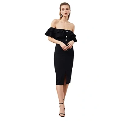Material Composition: 88% Polyester, 12% Elastane Occasion: The Schwarz Fitted Dresses is perfect for Cocktail occasions. Our Collection offers affordable fashion for every occasion and style – from casual & relaxed to smart & elegant. Trendyol Collection translates the latest runway trends into wearable outfits for your wardrobe. Design: It is a Carmen Collar Midi Dress for Women . This Woven Dress has a bodycone design with Straight pattern. If you are in between size,please size up. Wash at a maximum temperature of 30°C. Do not use bleach. Do not tumble dry. Iron at low temperature. Do not dry clean.
