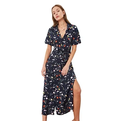 Material Composition: 60% Polyester, 26% Cotton, 7% Polyamide, 7% Viscose Occasion: The Navy blue Regular fit Dress is perfect for Casual occasions. Our Collection offers affordable fashion for every occasion and style – from casual & relaxed to smart & elegant. Trendyol Collection translates the latest runway trends into wearable outfits for your wardrobe. Design: It is a Shirt collar Maxi Dress for Women . This Woven Dress has a Shirt dress design with Floral pattern. If you are in between size,please size up. Please check the product label for detailed care instructions.