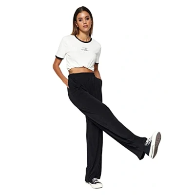 Material Composition: 96% Polyester, 4% Elastane Occasion: The Black Trousers is perfect for Casual occasions Our Collection offers affordable fashion for every occasion and style – from casual & relaxed to smart & elegant Trendyol Collection translates the latest runway trends into wearable outfits for your wardrobe Design: This Normal Waist Knit Trousers for Women has fit and Wide leg with a Plain pattern If you are in between size,please size up Please check the product label for detailed care instructions