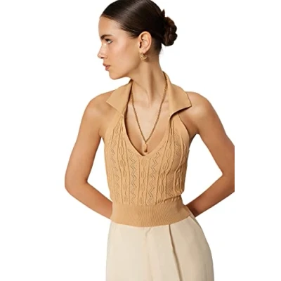 Material Composition: 100% Polyester Occasion: The Beige Regular fit Blouse is perfect for Casual occasions. Our Collection offers affordable fashion for every occasion and style – from casual & relaxed to smart & elegant. Trendyol Collection translates the latest runway trends into wearable outfits for your wardrobe. Design: This Basic Knitwear Blouse for Women has Sleeveless Polo neck Plain pattern. It is Regular fit fit. If you are in between size,please size up. Please check the product label for detailed care instructions.