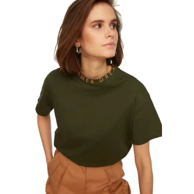 Material Composition: 100% Cotton Occasion: The Grün Regular fit T-Shirts is perfect for Casual occasions. Our Collection offers affordable fashion for every occasion and style – from casual & relaxed to smart & elegant. Trendyol Collection translates the latest runway trends into wearable outfits for your wardrobe. Design: This Basic Knitted T-Shirt for Women has Short Sleeve Standing collar Motto pattern. It is Regular fit fit. If you are in between size,please size up. Wash at a maximum temperature of 30°C. Do not use bleach. Do not tumble dry. Iron at medium temperature. Do not dry clean.