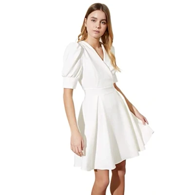 Material Composition: 88% Polyester, 12% Elastane Occasion: The Ecru Regular fit Dress is perfect for Business occasions. Our Collection offers affordable fashion for every occasion and style – from casual & relaxed to smart & elegant. Trendyol Collection translates the latest runway trends into wearable outfits for your wardrobe. Design: It is a Cache-coeur Mini Dress for Female. This Woven Dress has a A-line design with Plain pattern. If you are in between size,please size up. Please check the product label for detailed care instructions.