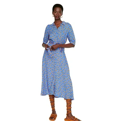 Material Composition: 100% Viscose Occasion: The Blue Regular Dress is perfect for Casual occasions Our collection offers affordable fashion for every occasion and style Trendyol translates the latest runway trends into wearable outfits Design: It is a Shirt collar Midi Blue Dress for Women / Girl This Woven Dress has a Shirt dress design with a Floral pattern If you are in between size, please size up