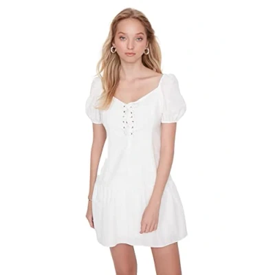 Trendyol Women's Mini Ruffle Hem Regular Dress, Ecru, 34 UK