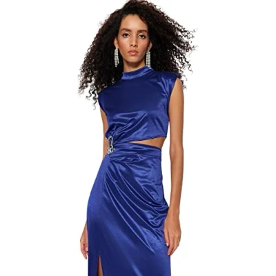 Material Composition: 100% Polyester||Occasion: The Sax Fitted Evening Dress is perfect for Party occasions. Our Collection offers affordable fashion for every occasion and style – from casual & relaxed to smart & elegant. Trendyol Collection translates the latest runway trends into wearable outfits for your wardrobe.||Design: It is a Standing collar Evening Dress for Women . This Knit Evening Dress has a Shift design with Plain pattern.||If you are in between size,please size up.||Hand wash