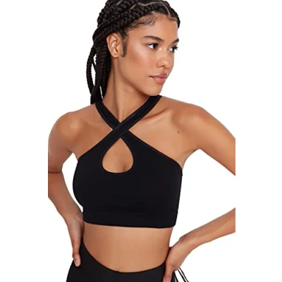 Trendyol Women's Sportswear Crop Asymmetrical Collar Knit Sports Bra, Black, XS/S