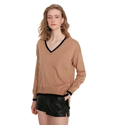 Trendyol Women's V neck Plain Regular Sweater Sweatshirt, Camel, M UK