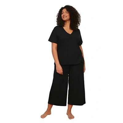 Trendyol Women Straight Knitted T shirt Trousers Plus Size Pajamas Set Schwarz