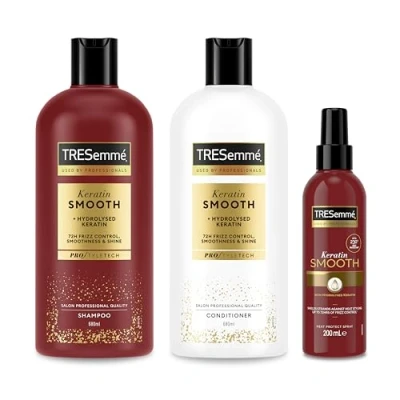 Transform frizz with the TRESemmé Keratin Smooth bundle of 3: Includes shampoo, conditioner and Keratin Smooth Heat Protect Spray for sleek, luxuriously smooth hair Keratin Smooth Heat Protect Spray - 5 benefits in one product: Reduces frizz, untangles knots, enhances shine, improves softness and effectively minimises flyaways Discover the nourishing power of the TRESemmé Hair Care: Featuring PRO Style Technology for intense revitalisation - works from within to transform damaged hair Certified compassion: TRESemmé Hair Care is committed to cruelty-free beauty, as our entire line is free from animal testing, and proud to be PETA-approved TRESemmé's mission is to empower your style - our professional hair care products are designed to help you achieve your personal look and aspirations with confidence