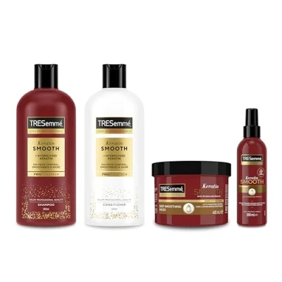 Transform frizz with the TRESemmé Keratin Smooth bundle of 4: Includes shampoo, conditioner, Pro Collection Keratin Smooth Heat Protect Spray and Deep Smoothing Mask Five benefits in one product: Keratin Smooth Heat Protect Spray reduces frizz, untangles knots, enhances shine, improves softness and protects against humidity TRESemmé Keratin Smooth Deep Smoothing Mask: Effectively untangles knots, untangles knots, enhances shine, improves softness and protects against humidity Discover the nourishing power of the TRESemmé Hair Care: Featuring PRO Style Technology for intense revitalisation - works from within to transform damaged hair Certified compassion: TRESemmé Hair Care is committed to cruelty-free beauty, as our entire line is free from animal testing, and proud to be PETA-approved