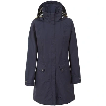 Yarn dyed striped lining. Contrast trims. Adjustable concealed hood. Longer length. Adjustable stud cuffs. Stiffened front strap with chin guard. 2 side pockets. 2 pockets with flaps. Waterproof 5000mm, breathable 5000mvp, taped seams, windproof. 100% Polyamide PU coating, Lining: 65% Polyester/35% Cotton jersey. Trespass Womens Chest Sizing (approx): XS/8 - 32in/81cm, S/10 - 34in/86cm, M/12 - 36in/91.4cm, L/14 - 38in/96.5cm, XL/16 - 40in/101.5cm, XXL/18 - 42in/106.5cm.