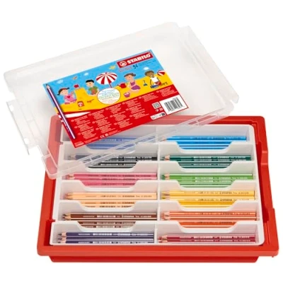 Comes in a Gratnell's tray of 96 pencils with 12 assorted colours, perfect for large classrooms. Take advantage of the triangular design to promote the recommended tripod grip from the early stages. It has a line width of 4.2mm. STABILO Trio thick is available in up to 24 rich colours. 0