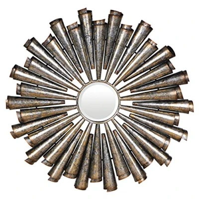 ManoManoGeneral description Alternating lengths of cone-shaped iron rays, with scrolled edges, radiate from the edge of the round mirror. Their distressed, mottled surface adds color and texture, lending this mirror a reclaimed, upcycled feel. The round, central mirror features a luxurious bevelled rim. Style it with furnishings from the Tribeca range to create a coordinated, loft-style look.