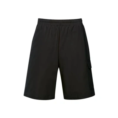 Woven fabric Classic cut, unisex Knee length Hand pocket and patch leg pocket Elastic waistband with drawstring