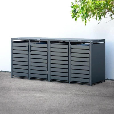 Buy Sheds DirectKeep your wheelie bins tucked neatly away out of sight and enhance your outdoor space with the Trimetals Quad 240L Metal Wheelie Bin Store (2.64m x 0.80m). Sturdy and Stylish Bin Store This attractive metal bin store is the solution to the issue of unsightly outdoor bins. Modern in design and anthracite grey in colour, it provides a secure and accessible home for your bins, and can also double as a garden storage cabinet or box if you're looking for additional storage space. The wheelie bin store is made from robust, high-quality, powder-coated galvanised steel, which is backed by a two-year guarantee. Your bins will remain fully functional while inside the store as it boasts a clever internal mechanism with gas-assisted springs that lifts the bin and store lids simultaneously. Moving the bins in and out on collection day is a smooth process too, thanks to the hinged doors. As well as looking great and being long-lasting, another benefit of the Trimetals wheelie bin store is that it shields your bins from direct sunlight, helping to minimise unpleasant odours during the warmer months. Trimetals Metal Storage Range This metal wheelie bin storage is available in four sizes that accommodate between one and four bins, so there's room for household waste, recyclables, garden waste and more. Free Shipping Free delivery is available to most UK postcodes. Key Features Accommodates four 240L wheelie bins Modern dark grey design 2-year guarantee Constructed from powder-coated galvanised steel Hinged doors and gas-assisted springs in the lids for easy access Robust, long-lasting and low maintenance Shields your bins from direct sunlight, helping to reduce odours Also available for one, two or three wheelie bins