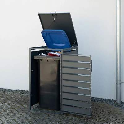 Hide unsightly outdoor bins and bring a stylish, modern touch to your garden with the Trimetals Single 240L Anthracite Metal Wheelie Bin Store (0.68m x 0.80m). Stylish Wheelie Bin Storage Wheelie bins are a necessity for any home, but they're not the most attractive of garden items. Thankfully, wheelie bin storage provides a discrete solution that allows you to tuck your bins away out of sight and keep your outdoor space neat and tidy. The sleek Trimetals Single 240L Anthracite Metal Wheelie Bin store is manufactured from durable, high-quality steel and has a lovely dark grey finish. The contemporary design, with its solid frame and slatted door, not only looks stunning but also shields your bins from direct sunlight, helping to minimise unpleasant odours in warmer weather. The hinged door makes it easy to roll your bins in and out of the store on collection day. When a bin is inside the store, simply lift the store's lid and the internal mechanism with its gas-assisted springs will lift the lid of the bin at the same time, enabling you to deposit waste without having to touch the bin. Multiple Sizes and Uses This metal wheelie bin storage is available in four sizes that accommodate between one and four bins. In addition, the versatile nature of the store means it can double as a garden storage cabinet or garden storage box and help to keep your outdoor space free from clutter. Free Delivery We offer free delivery to the majority of UK addresses. Key Features Contemporary dark grey wheelie bin store with space for one 240L bin Made from powder-coated galvanised steel Easy to open, with gas pressure springs in the lid Low maintenance and durable Odour-reducing design Available in four sizes 2-year guarantee