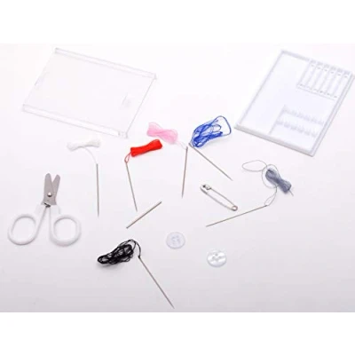 Needles & thread x5 Handy scissors Black, white, red, blue, grey and pink Safety pin Buttons x2