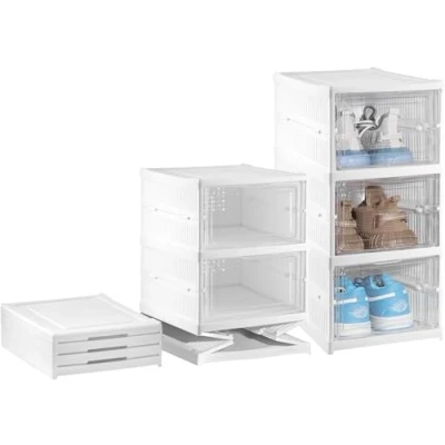 Effortless Snap-Together Assembly: Our shoe organiser requires no tools for quick and hassle-free setup. Simply connect the durable PP plastic boxes to form a stable, integrated cabinet in minutes, saving you time and effort. Crystal-Clear PS Doors & Full Visibility: Each stackable box features a transparent polystyrene door, allowing you to see your entire shoe collection at a glance. Quickly identify and select your favourite pair of trainers or boots without opening every lid. Spacious Interiors for UK Shoe Sizes: Generously sized at 36.5x25.5x19.5cm (13.6"L x 10"W x 7.7"H), each compartment comfortably accommodates shoes up to UK men's size 12. It's ideal for storing bulky trainers, heels, boots, and seasonal footwear neatly. Robust, Stackable & Space-Saving Design: Crafted from high-quality, impact-resistant PP plastic, this unit is built to last. The sturdy stackable design maximises vertical space in your wardrobe, under the bed, or in your hallway, keeping floors tidy and clutter-free. Versatile Foldable Storage Solution: When not in use, the entire cabinet can be easily folded down flat for compact storage under a bed or in a cupboard. Its sleek, minimalist design makes it a practical and stylish addition to any room in your home.