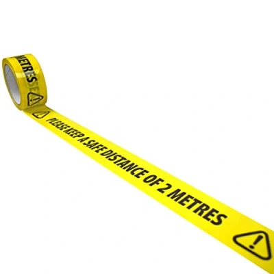 AmazonIdeal Social Distancing Tape, Yellow Backing, Black Writing Reads "PLEASE KEEP A SAFE DISTANCE OF 2 METRES" Alternative to Hazard Tape with Strong Adhesion PVC Tape With Acrylic Laminate - Laminated To Keep Print 48mm Wide x 33-Metres Long, Sticks to Most Floors