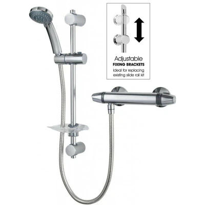 General description This modern single outlet bar mixer shower features an adjustable shower head handset, allowing you to create a relaxing shower experience tailored to your mood. The stylish round bar valve simplifies your bathroom redesign while providing reliability and aesthetic appeal. With controls on each end, you can easily fine-tune the temperature and flow for optimal comfort. The shower handset offers three different spray settings, enhancing performance and practicality with its polished chrome finish. Technical specifications Flow Rates: Min 0.1 Bar - Max 5.0 Bar, 5-41 Ltrs Per Min Shower Type: Bar Mixer Outlets: Single Outlet Style: Contemporary Colour: Chrome Head Type: Handset Low Pressure Suitable: Yes Combi Boiler Suitable: Yes High Pressure Suitable: Yes Water Feed: Rear Wall Fed Temperature Control: Thermostatic Installation Type: Exposed Installation Designed for simple installation and easy replacement Adjustable fixing centres allow reuse of previous fixing
