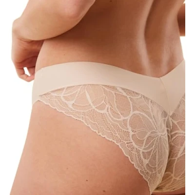 New interpretation of medium coverage high-leg tai brief with modern back design Smooth and invisible waistband and bonding prevent digging in Combination of smooth lace and creamy soft touch micro fibre