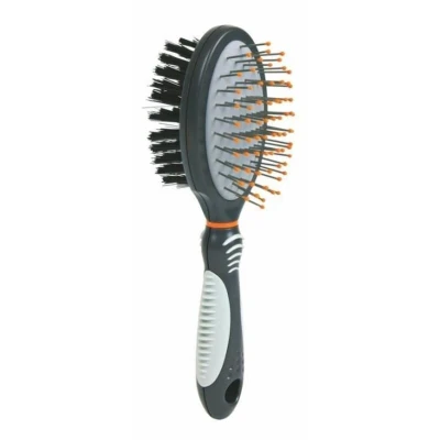 This TRIXIE double-sided brush measuring 7 × 22 cm is ideal for the gentle grooming of your dog's coat. Its special shape allows you to reach difficult areas, while the non-slip rubber handle ensures a comfortable grip. Made of plastic, nylon, and metal, it is suitable for medium-sized dogs.