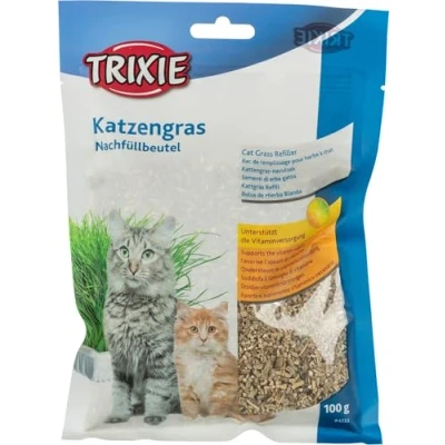 HEALTHY SUPPLEMENT: TRIXIE Cat Grass provides your cat with important vitamins and naturally supports its well-being and digestion. EASY TO GROW YOURSELF: The grass seeds can be planted in no time at all – for fresh greenery whenever your furry friend needs it. EXTRA SOFT: The soft grass is ideal for kittens and sensitive cats who like to nibble on fresh blades of grass. RICH IN VITAMINS: This refill set contains nutrient-rich seeds that promote vitality and healthy digestion. PRACTICAL REFILL BAG: The 100 g pack is perfect for refilling existing cat grass bowls and ensures a continuous supply of fresh grass.