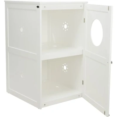 Cat house with 2 compartments H 90 cm. Dimensions: 53 width × 90 height × 58 cm depth. Cat hut with two compartments. MDF, varnished. to hide the litter tray. Prevents litter from splashing. Includes litter tray mat. Can also be used as a sleeping area. Free floor can be used as storage space for litter and accessories. The entrance opening at the top makes it easy to clean the litter box on the top floor. front door mounting TR-40239