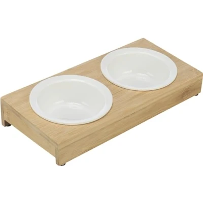 Set includes 2 ceramic feeders They are durable, easy to clean, and safe for your pet's feeding Feeders are placed on a sturdy bamboo stand