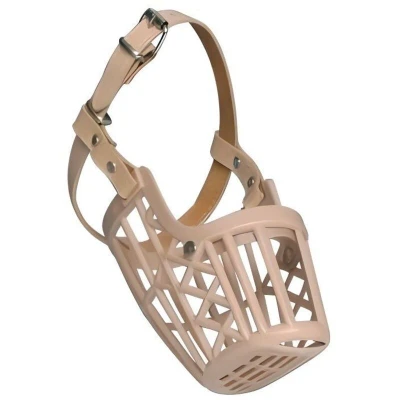 ManoManoPlastic muzzle for dogs, size M-L, with tight mesh for safety. Equipped with a leather strap, it is ideal for medium to large dogs. Beige/fawn color, it ensures comfort and safety during outings.
