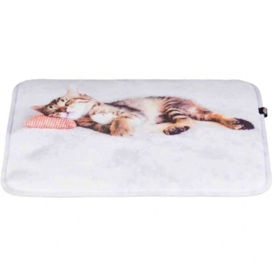 Rectangular mattress for small cats, made of polyester with a plush cover. Filled with fine foam and featuring a non-slip bottom for optimal comfort. Dimensions: 40 × 30 cm, grey color.