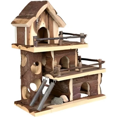Discover the Tammo House by Trixie, a 3-level habitat for rodents featuring a tunnel, suspended ladder, and decorative stones. Its base opens for easy cleaning. Ideal for mice and other small rodents, this habitat made of wood and plastic is designed for indoor use.
