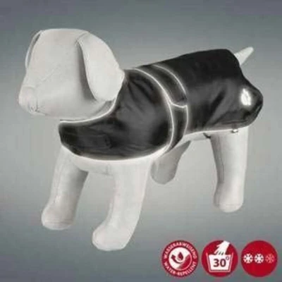 This TRIXIE Orléans dog coat, with a length of 80cm, is lined with plush for added comfort. It features reflective legs for enhanced safety, loops for the hind legs, and fastens with Velcro. Made of durable black nylon.