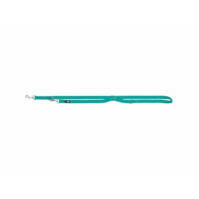 Adjustable nylon leash for dogs, ideal for outdoor use. Length of 2.00 m and width of 20 mm, with 3 possible adjustments. Equipped with an eyelet for attaching a tag or a flasher. Ocean color, perfect for medium-sized animals.