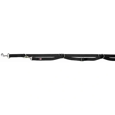 TRIXIE Premium Adjustable Leash - Extra Long - L-XL: 3m - 25mm - Black. Article reference 196901. Strap leash with 4 adjustable levels and 3 continuously adjustable rings for a tailored fit and varied use. Easily attachable around the waist thanks to the adjustable rings. Eyelet to attach a tag or a flasher, for example. Dimensions: 3.00 m/25.