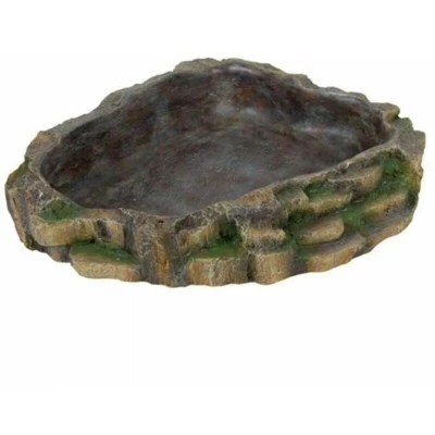 Polyester resin bowl for reptiles, ideal for water and food. Dimensions: 24x20cm. Designed with inner steps for easy access to the contents. Its realistic texture and smooth interior make cleaning easy. Suitable for lizards and other medium-sized reptiles.