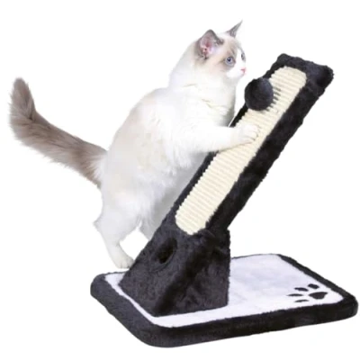 Scratching post for house cats Completely wrapped in natural sisal Protects areas the cat would use to mark with scratches Come with 2 toys Available in black/cream colour