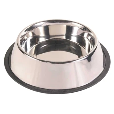 Anti-slip dog bowl with removable rubber ring Made of stainless steel A heavy weight dog bowl, which is sturdy and securely holds the contents Capacity: 2.8 litre 24 cm bowl diameter New in original packing Attractive price High quality look