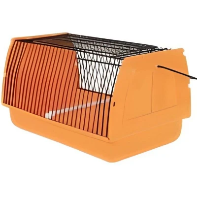 Transport cage for rodents and small birds, dimensions 22 × 14 × 15 cm. Made of plastic, it is ideal for transporting to the vet. Equipped with a perch, a removable handle, and black metal mesh.