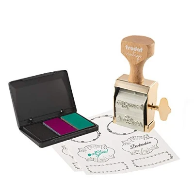 Set consists of a rotary stamp, ink pad with colours black, purple, green and printable adhesive labels Stamp set for special moments or those that should become – an original print says more than a thousand words Word band stamp includes the following text: Ich Liebe Dich, Dankeschön, Einfach So, Viel Glück, Gute Bessung, Kopf hoch Included labels extra absorbent and guarantee optimal and clean print – other packaging and paper goods can also be printed: cards, envelopes, gift boxes, heart boxes, kraft paper, paper bags, gift tags, stickers and much more. Trodat Vintage Ink Pad available in other colour combinations (item no. 162601, 162602, 162603) - Trodat Vintage Labels (162616) also available separately