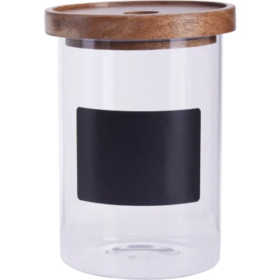 ManoManoGeneral description This rounded glass container is designed to keep contents neatly stored for an extended period. The clear glass features a chalkboard label for easy identification of contents, while the acacia wood lid ensures that items remain dry and airtight. Technical specifications Capacity: 950ml