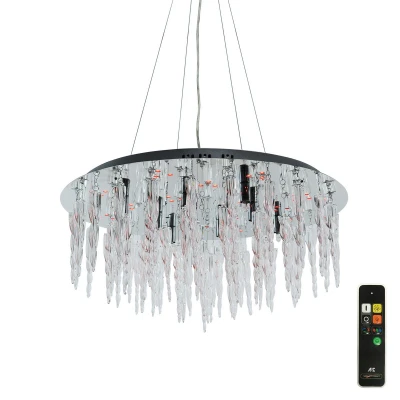 A truly beautiful modern collection decorated in icicle shaped glass and a perimeter of RGB Leds for that perfect ambient effect. All items are supplied with a remote control that can control all the features of the fittings. The Leds have 7 preset colours and 2 colour changing modes. The white halogen lamps and the LEDs can be used independently or together. This collection is not suitable for dimming.