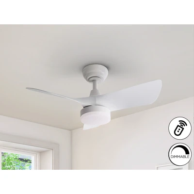 Net LightingCeiling fan with DIMMABLE LED light and CCT (adjustable light temperature). Made of metal and acrylic blades, matt white finish. Opal acrylic diffuser. DC Motor, 6 speeds and reverse. Timer, breeze and memory function.