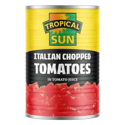 Fresh and Flavorful: Concerned about quality and taste? Concerned about quality and taste? Tropical Sun Italian Chopped Tomatoes offer a rich and authentic flavor that enhances your dishes. Premium Ingredients: Made with only the finest, vine-ripened tomatoes, our canned tomatoes are free from artificial preservatives, ensuring a natural and delicious addition to your recipes. Versatile and Convenient: Perfect for a variety of dishes, our chopped tomatoes tinned provide a convenient solution for quick meal prep, delivering a burst of natural tomato flavor in every bite. Easy to Use: Simply open the tin and add our tinned chopped tomatoes to your sauces, stews, or soups for an instant upgrade. Great for pasta, pizza, and more! From Tropical Sun: At Tropical Sun, we are dedicated to bringing you the finest ingredients from around the world. Enjoy the authentic taste of Italy with our Italian Chopped Tomatoes, crafted for your culinary delight.