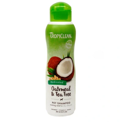 TropiClean Oatmeal and Tea Tree Shampoo 355ml is a medicated, pH-balanced shampoo that soothes and relieves itchy, irritated pet skin using oatmeal, tea tree, and natural extracts. Free from soap, parabens, and dyes, it gently exfoliates and moisturizes for healthier skin and coat.