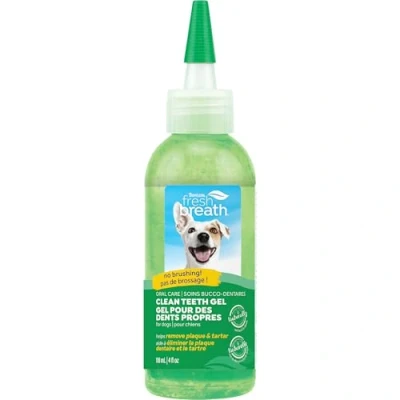 REMOVES PLAQUE AND TARTAR - TropiClean Fresh Breath Clean Teeth Oral Care Gel is an easy way to help remove plaque and tartar buildup from your dog's teeth. When used daily as directed, you can see cleaner teeth in 30 days or less! UNIQUE BLEND - Our Clean Teeth Oral Care Gel is formulated with a unique blend of ingredients that work together to help remove plaque & tartar safely and effectively! FRESH BREATH - Helps freshen your pet's breath for friendlier smooches! HOW TO USE - Simply apply two drops of TropiClean Fresh Breath Clean Teeth Oral Care Gel to each side of your dog's mouth daily to help remove plaque & tartar. No brushing required! HEALTHY DOGS - Oral care is about more than making your pets’ smiles sparkle - it’s an important component of their overall health. In fact, 80% of dogs begin to show signs of oral disease by age 3 WANT EVEN MORE FRESH MOMENTS? Our natural pet products include dental care, itch relief, flea & tick solutions and an array of grooming products all designed to let your pet put their best paw forward. You make the moments, we make them fresh. Safe for routine use when used as directed Proudly made in the U.S.A. For dogs and cats 12 weeks and older Contains one (1) 118 ml bottle of TropiClean Fresh Breath No Brushing Clean Teeth Dental & Oral Care Gel